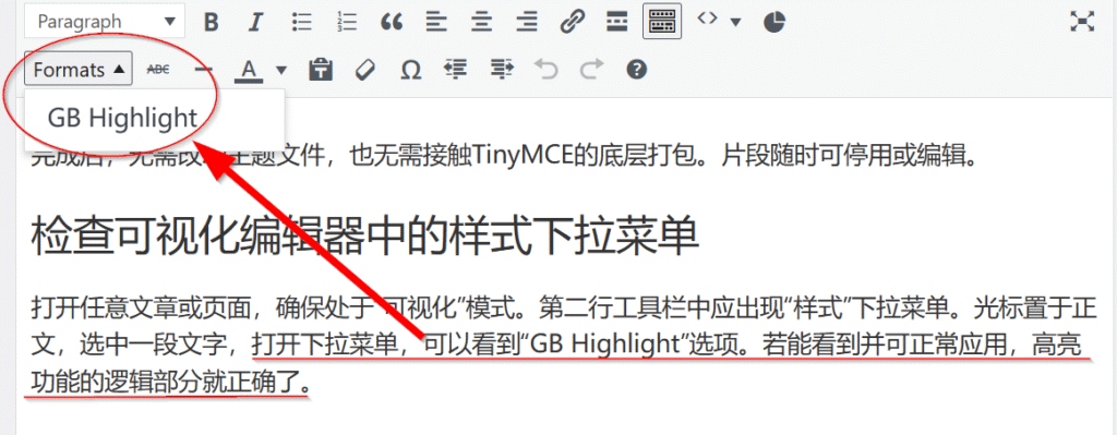 打开任意文章或页面,确保处于“可视化”模式。第二行工具栏中应出现“样式”下拉菜单。光标置于正文,选中一段文字,打开下拉菜单,可以看到“GB Highlight”选项。若能看到并可正常应用,高亮功能的逻辑部分就正确了。